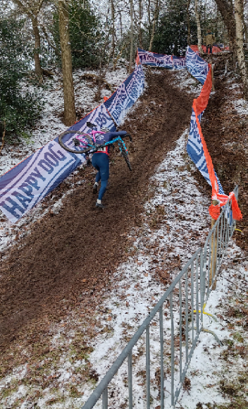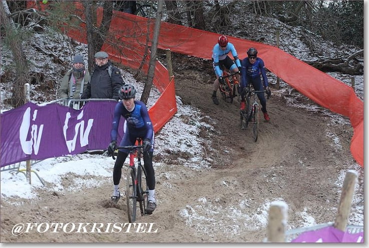Bij de Masters 50+ zagen we Pierre Deen en Jan van Herwijnen in actie. (Plus een handvol ACC’ers van WVA, Ulysses en Olympia die verrassend goed waren. Zou ‘t een trend worden, zo plots landelijk gaan rijden?) Jan had z’n agenda schoongeveegd en begon vrijdagmiddag al aan de verkenning. Het doel om zonder uitklikken door het zand naar beneden te gaan werd gehaald. Het goede gevoel was er, nu nog op wedstrijdsnelheid in wat koudere omstandigheden. De sprint over de startstrook was te lang, maar in het bos wat goed gemaakt, daarna op de weide nogmaals. Daarna begon de misère met het pedaal na uitklikken – aangevroren zand en modder deden z’n werk. Kramp in het been, afdalingen ‘los’, val in het zand. Gevoelloze voeten hielp ook niet echt op de bevroren ondergrond, en wat was ‘t ineens koud geworden. Plek 23.