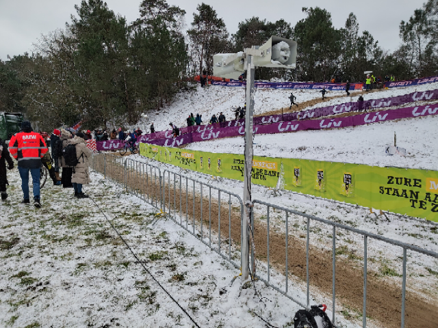 Het winterweer hield Nederland (en de NK-crossers in het bijzonder) al een ruime week in haar greep. Sneeuw in de week vooraf, dooi op de vrijdagse parcoursverkenning, gevolgd door twee nachten met vorst. Wat zou dat met het parcours doen? IJs en bevroren sporen? Kortom een vooruitzicht met volop onzekerheid. Echter, de cross wordt nooit zo heet verreden als ze wordt verwacht (slechte variant van het spreekwoord, verzin zelf een betere). De organisatie dacht mee met de renners en kwam met de oplossing: zo bracht ze op de eerste wedstrijddag in alle vroegte extra zand aan op de diepste sporen en maakte enkele passages sneeuwvrij. De brug werd goed gepekeld, en start-finish was zo schoon als op een zomerse dag.